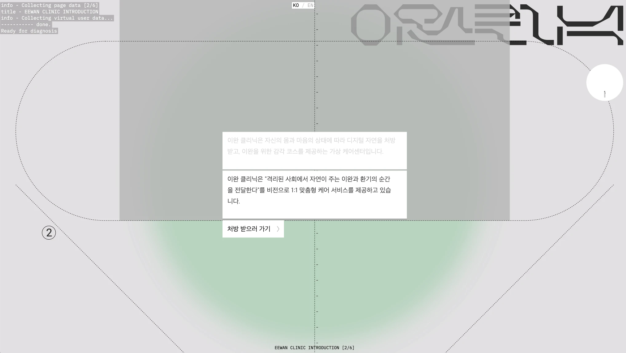 〈이완클리닉: 자연을 처방해 드립니다〉는 관람객의 마음 상태에 맞춰 가상 낙원으로 지칭되는 디지털 자연을 처방해 준다. 이는 일상에서 벗어나는 이완과 환기의 순간을 제공하며 미래형 클리닉센터로도 상상해 볼 수 있을 것이다. 작품의 완성을 위해 작가는 다양한 데이터를 차용하는데 심박수나 산소포화도 같은 개인의 바이오데이터와 딥러닝한 명화-감정 모델을 활용하여 맞춤형 자연을 처방한다. 여기에 SF 영화적 상상이 더해지고 VR 기술을 결합함으로써 처방한 디지털 자연(가상낙원)에 몰입할 수 있는 환경을 구축한다. 또한 디지털 처방의 체험 마지막 단계에는 음료 처방과 움직이는 오브제 처방과 같은 명상 단계를 함께 설정함으로써 후각, 미각과 같은 다양한 감각을 동시에 체험할 수 있는 것이 특징이다. 이러한 예술적 시도는 일상에서 벗어나는 순간을 제공함과 동시에 미래형 휴식은 무엇인지, 셀프케어에 대한 시도는 어떠한 방식으로 가능할지에 대한 질문과 가능성을 동시에 제시한다.