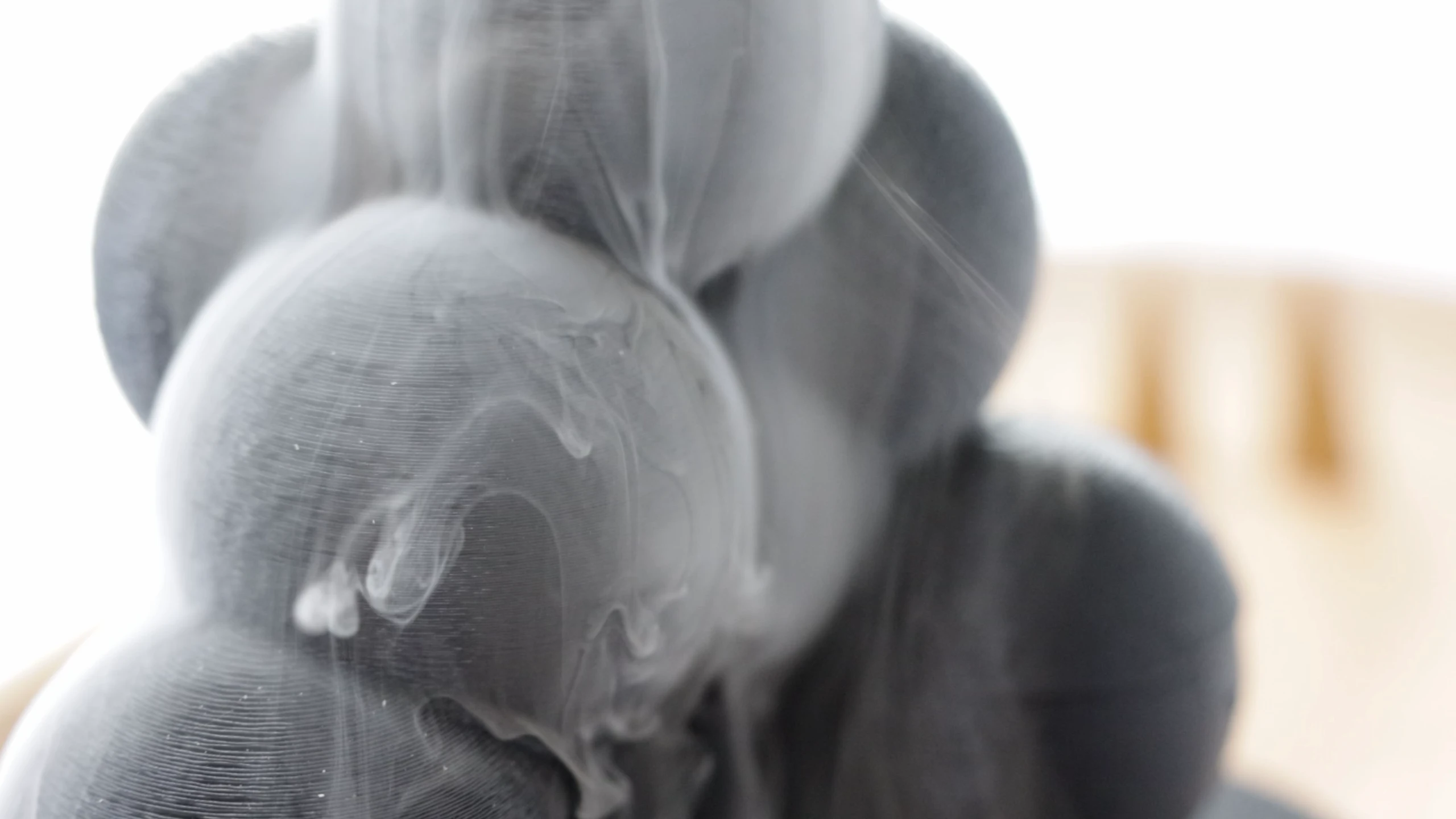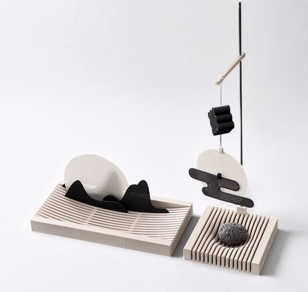 호흡에 따라 변화하는 음향은 시끄러운 일상으로부터 벗어나, 내 안에 집중할 수 있는 감각적 경험을 선사합니다. 공중에 떠 있는 듯한 스피커 오브제는 내부에 최소한의 구조로 지지되며, 부유하는 조형감을 연출합니다. 공간을 흐르듯 가로지르는 3D 프린트 패브릭은 바람에 반응하며 움직임을 유도하고, 섬세한 떨림을 통해 호흡이라는 테마를 시각화합니다. 다면체와 곡선을 혼합한 형태는 유기성과 구조성을 동시에 담아내며, 반투명한 표면은 관람자의 시점에 따라 밀도와 깊이가 달라 보이도록 설계되었습니다. 전체적으로는 가볍고 고요한 긴장감을 만들기 위해, 다양한 3D 프린팅 기법과 재료의 조합을 실험했습니다.