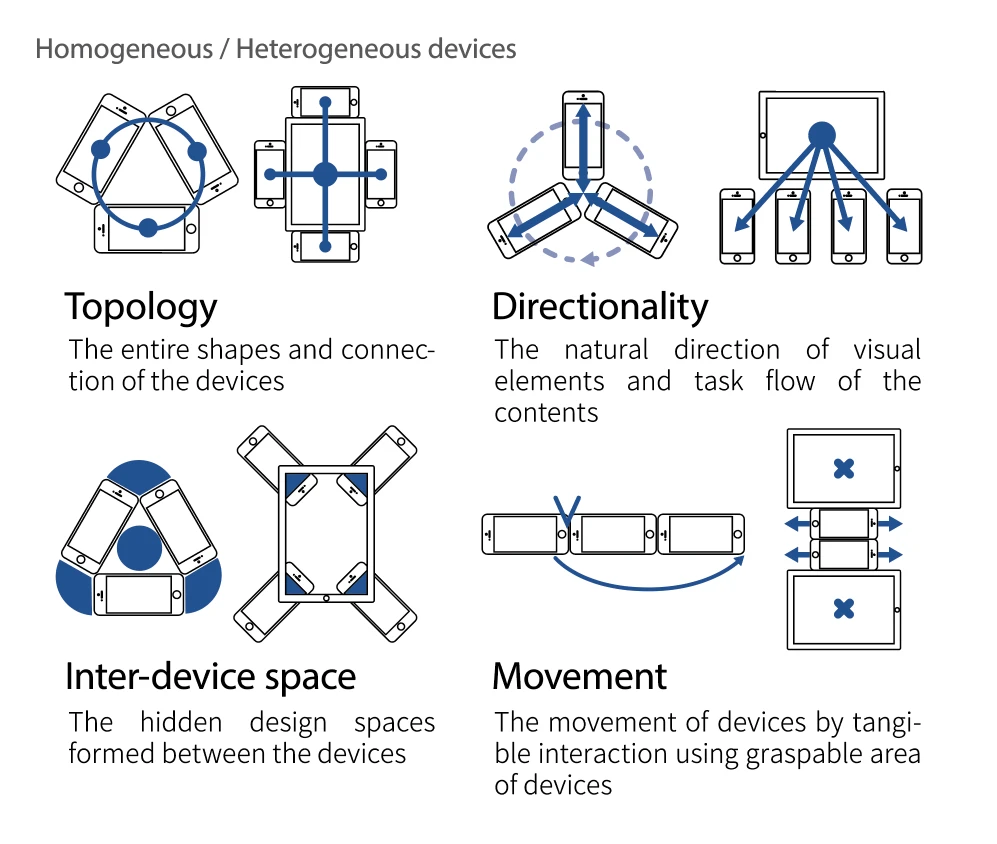 Nowadays, it is easy to find concepts for connecting mobile devices and looking at photos together. Despite the increasing interest in multi-device single display groupware (multi-device SDG) today, most of the existing research is limited to using a rectangular form array to enlarge the display. In this paper, we suggest a new way of assembling mobile devices to create unique forms, such as rings, bars, and radial displays, and to develop three games with them. During the development process, we conducted generative workshops to understand the inter-device interaction characteristics of the uniquely formed multi-device SDG. Directionality, inter-device space, and tangible interactions were extracted from the workshop. Through a user study of the developed games, we refined the characteristics and found additional design issues: sitting and ownership. The inter-device interaction characteristics and issues of multi-device SDG obtained from this study could be generally applied to collocated multi-mobile interactions.