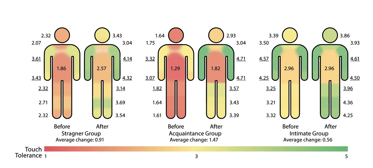 Interpersonal touch, one of the most primitive social languages, is an excellent design element frequently used in interaction design. In this paper, we present a richer understanding of it by using spatial factors and social relations among people, which has rarely been explored in interactive systems. We designed an interactive installation called “TouchBranch” where players can move light between branches placed at various distances by connecting their bodies. The user studies were conducted with 21 groups consisting of intimates, acquaintances, and strangers. We observed a change in the interpersonal touch pattern and touch tolerance according to each factor. Interestingly, the effect of the social relation was dramatic, but that of the spatial factor was not quantitatively significant. Nevertheless, we discovered that spatial factor can influence the interpersonal touch experience. Based on the results, we discuss in this paper the influence of two factors on the interpersonal touch that stands out in the context of interactive systems.